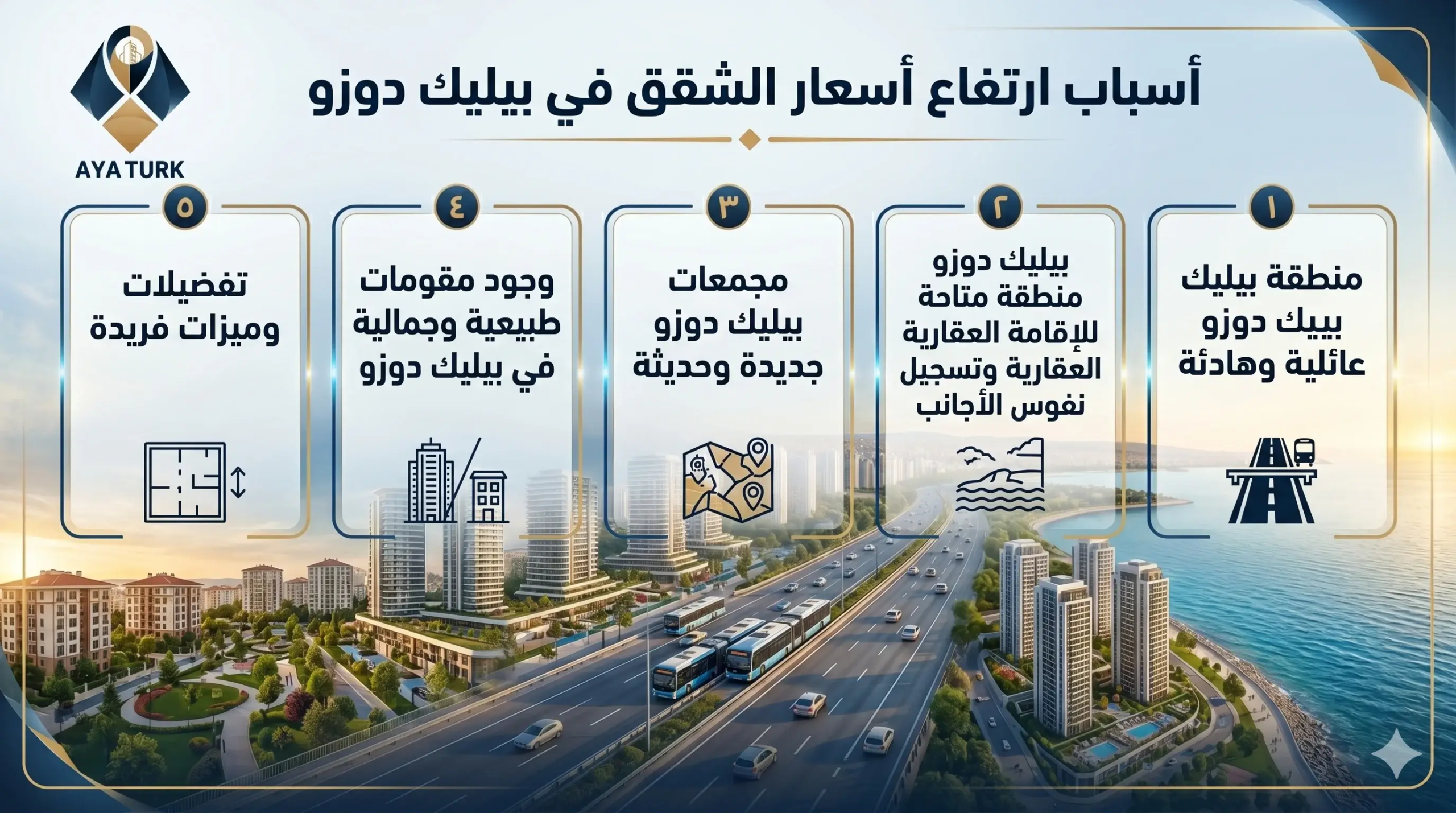 سواء كنت تبحث عن سكن عائلي هادئ أو استثمار بعائد إيجاري منتظم أو شقق للبيع في اسطنبول تؤهلك للإقامة العقارية، بيليك دوزو تقدم كل هذه الخيارات في مكان وأحد .. تواصل مع فريق آية تورك العقارية للحصول على استشارتك المجانية وأحدث عروض المنطقة لعام 2026.