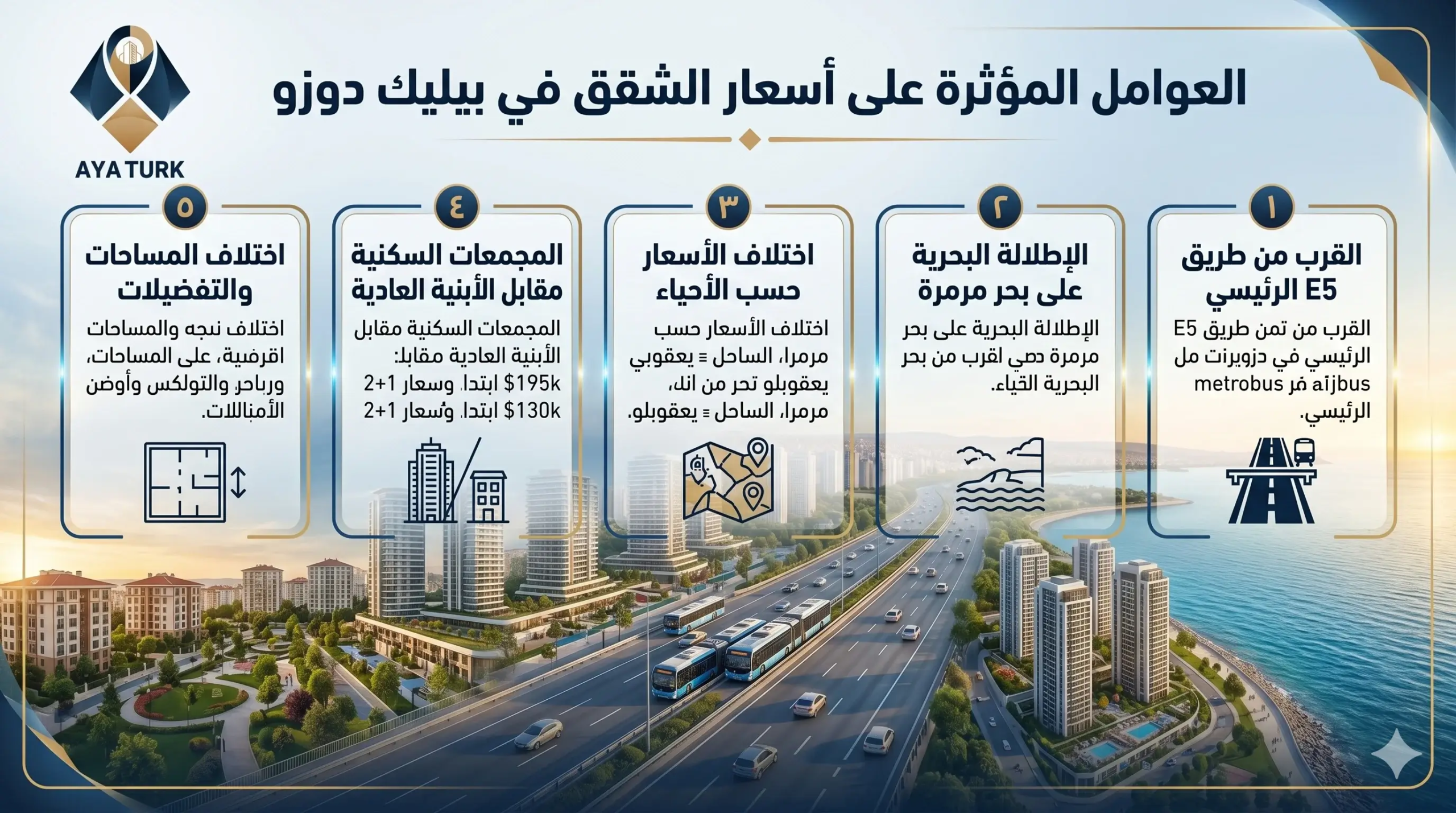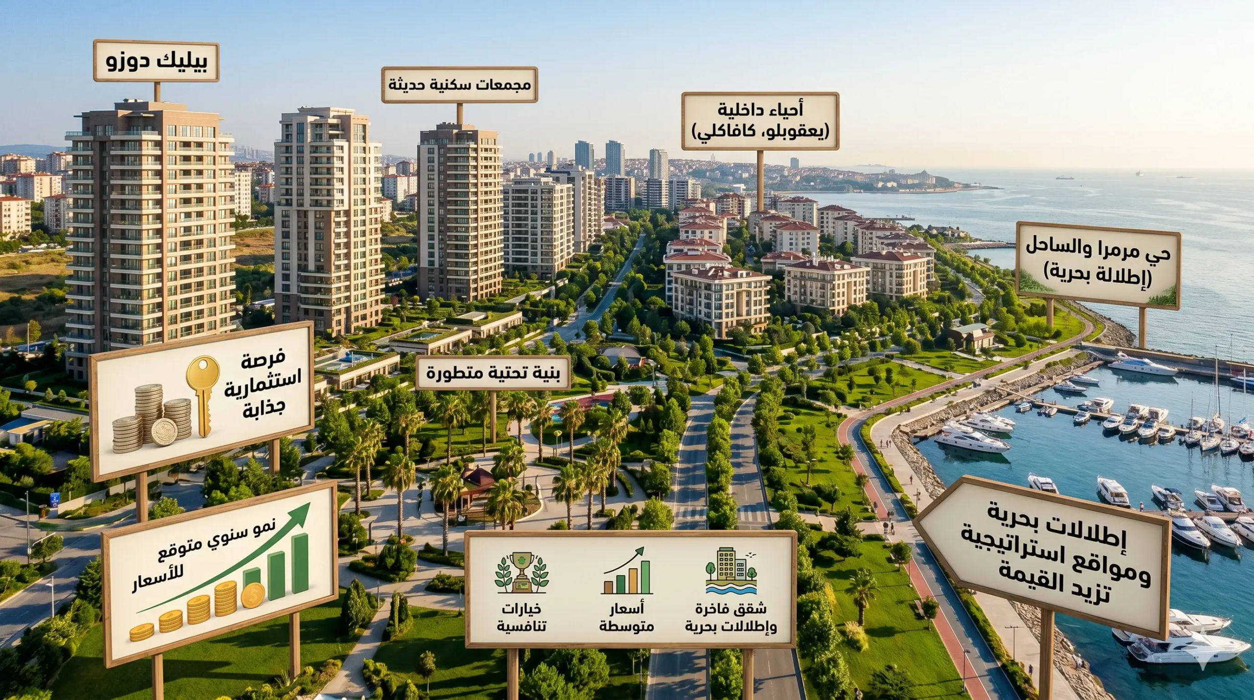 الإطلالة البحرية على بحر مرمرة هي أقوى عامل في رفع اسعار الشقق في بيليك دوزو، إذ تحمل الشقق المطلة على البحر في حيّي مرمرا والساحل سعراً أعلى بنسبة 25% إلى 40% عن متوسط المنطقة، وبعض الوحدات الفاخرة ذات الإطلالة البانورامية الكاملة تتجاوز هذا الفارق .. الطلب على هذه الشقق مستمر من المشترين الخليجيين الباحثين عن إطلالة بحرية بسعر أقل بكثير من مناطق كساريير أو بيبيك.