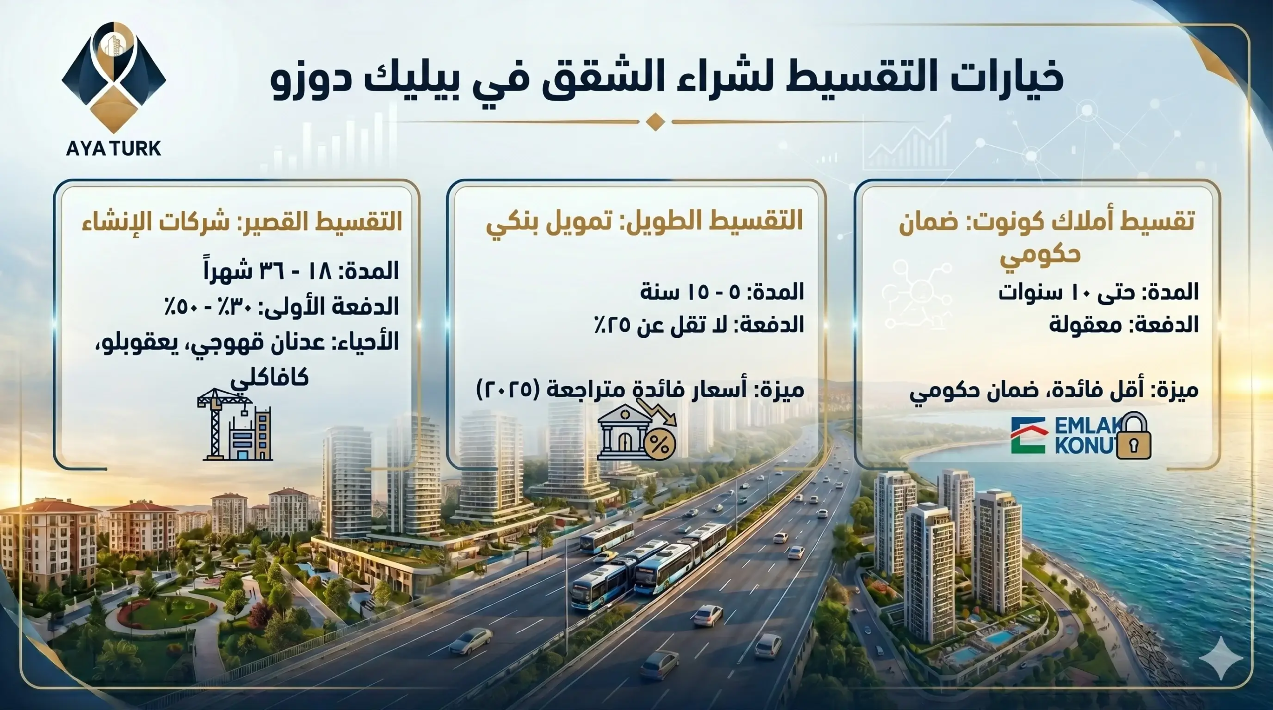 تقسيط أملاك كونوت الحكومية متاح على مشاريع Emlak Konut الموجودة في نطاق المنطقة، ويمتد حتى 10 سنوات بدفعة أولى معقولة وأسعار فائدة أقل من البنوك التجارية، وهو الخيار الأكثر إقبالاً من العائلات العربية الباحثة عن ضمان حكومي مع سداد مريح.